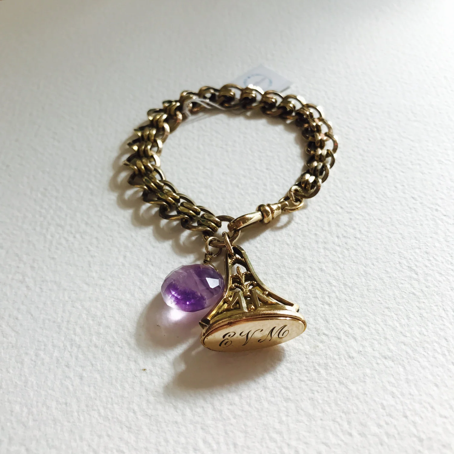 Antique Watch Chain Bracelet with Engraved Fob and Amethyst Dangle